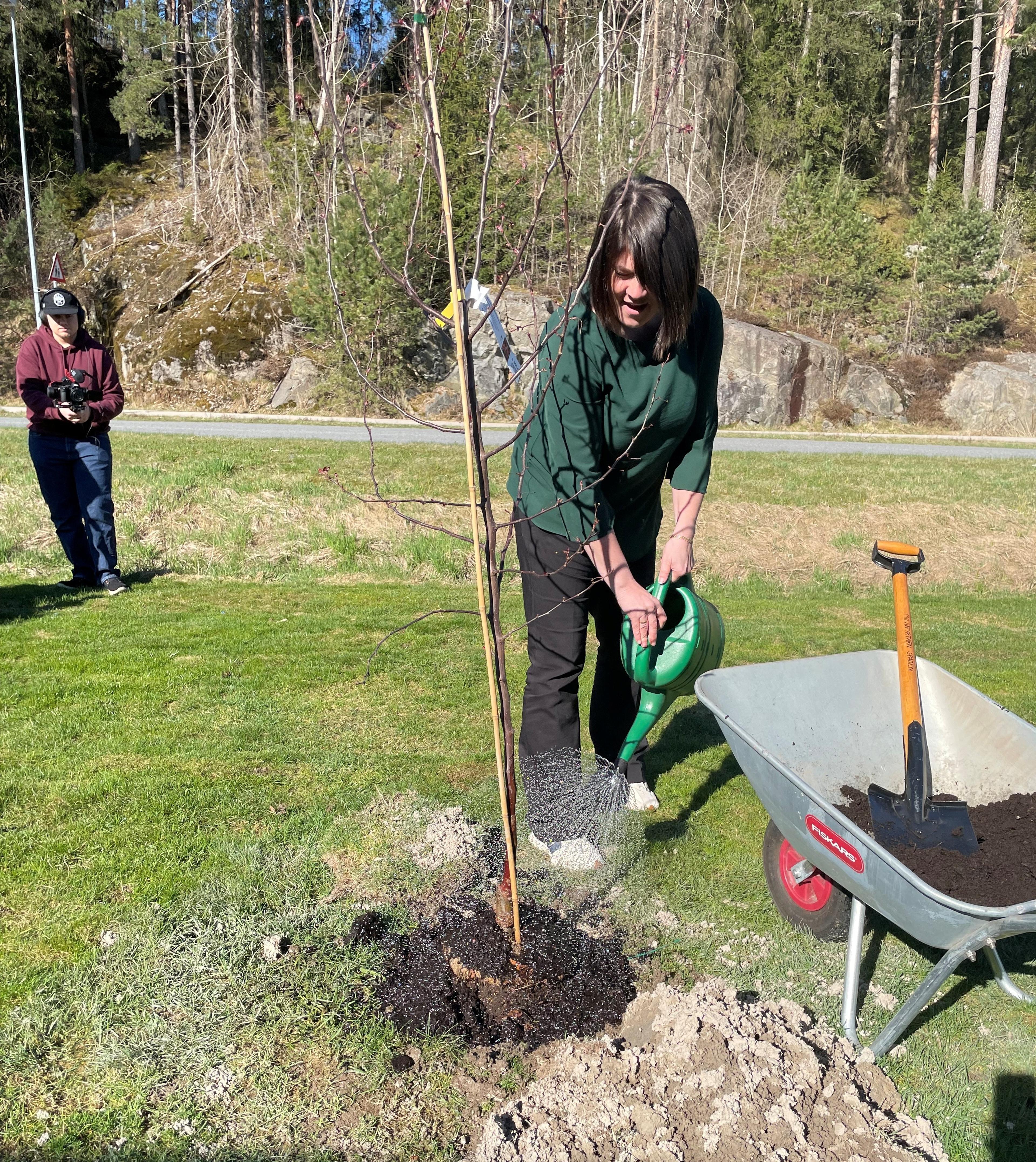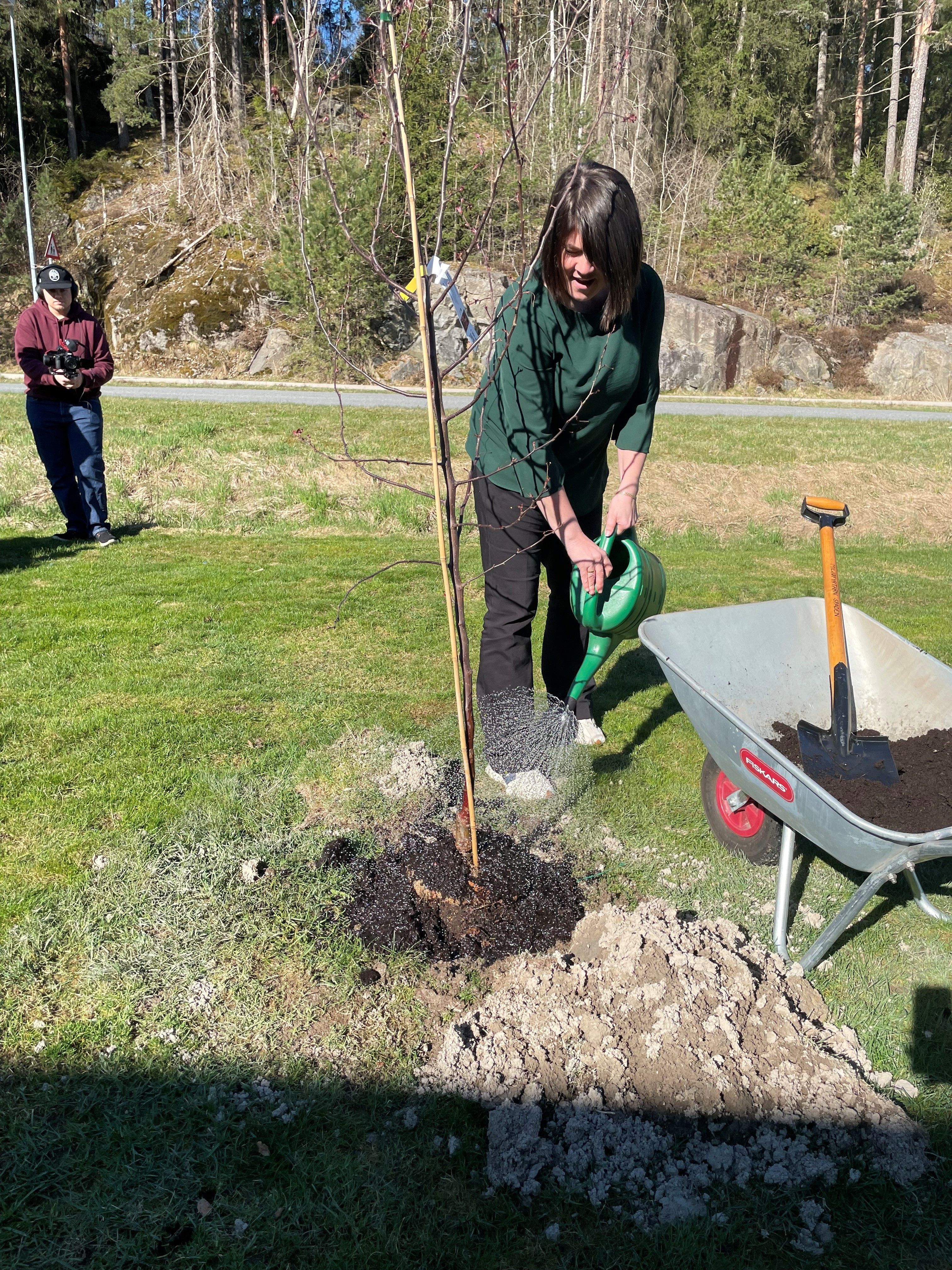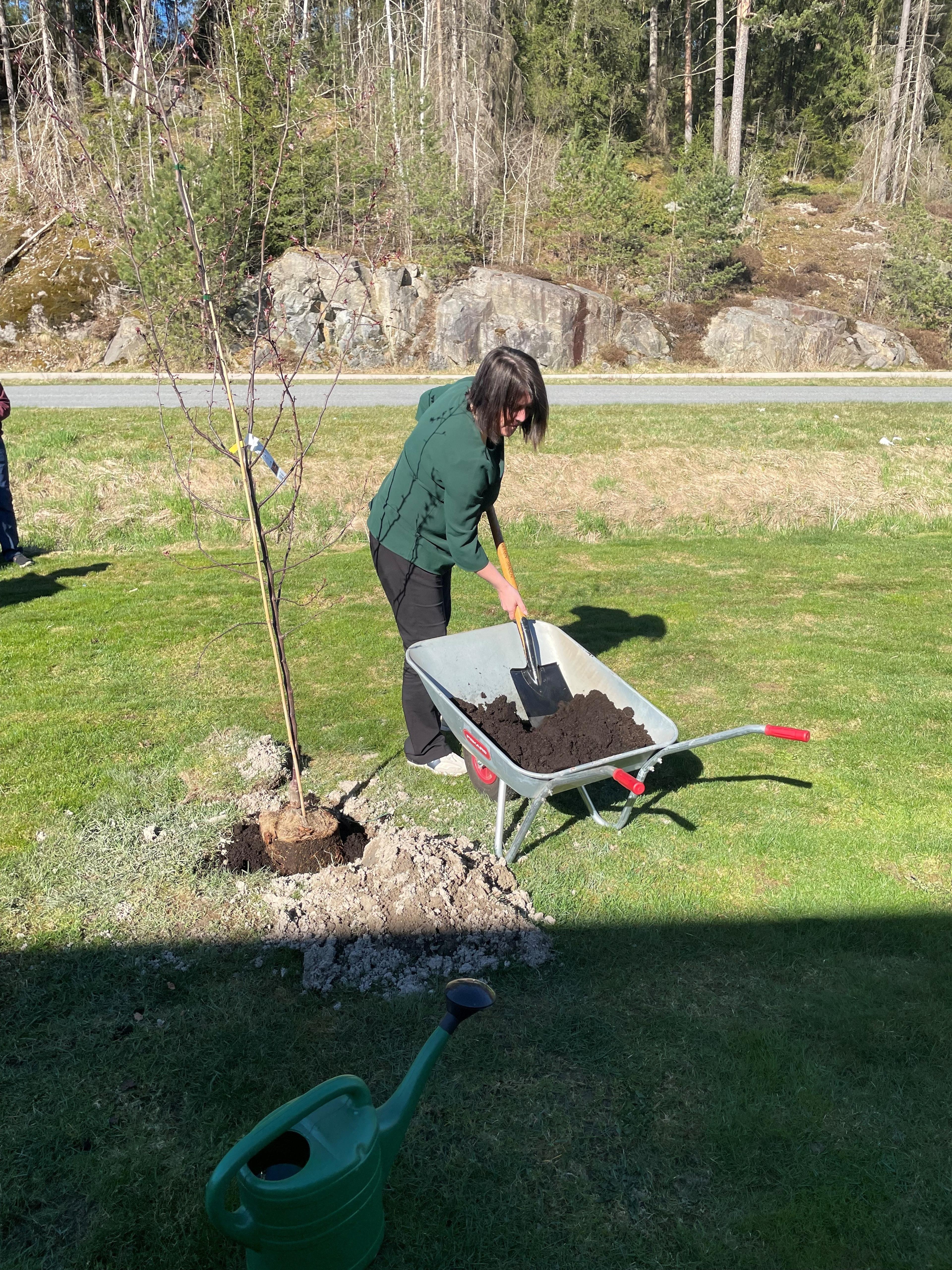 Ute på plenen lå alt til rette for en hyggelig markering. Med sol i ansiktet, nydelig kake på fatet og spader klare til dyst, var det duket for både seremoni og symbolikk. Flere hadde tatt turen, og blant dem var varaordfører Kathrine Hestø Hansen og næringssjef Terje Myrseth, som sto for den offisielle overrekkelsen av plaketten. Kathrine tok også grep – bokstavelig talt – og plantet et vakkert prydepletre bak bygget. Et ganske fint bilde på det hele, egentlig.