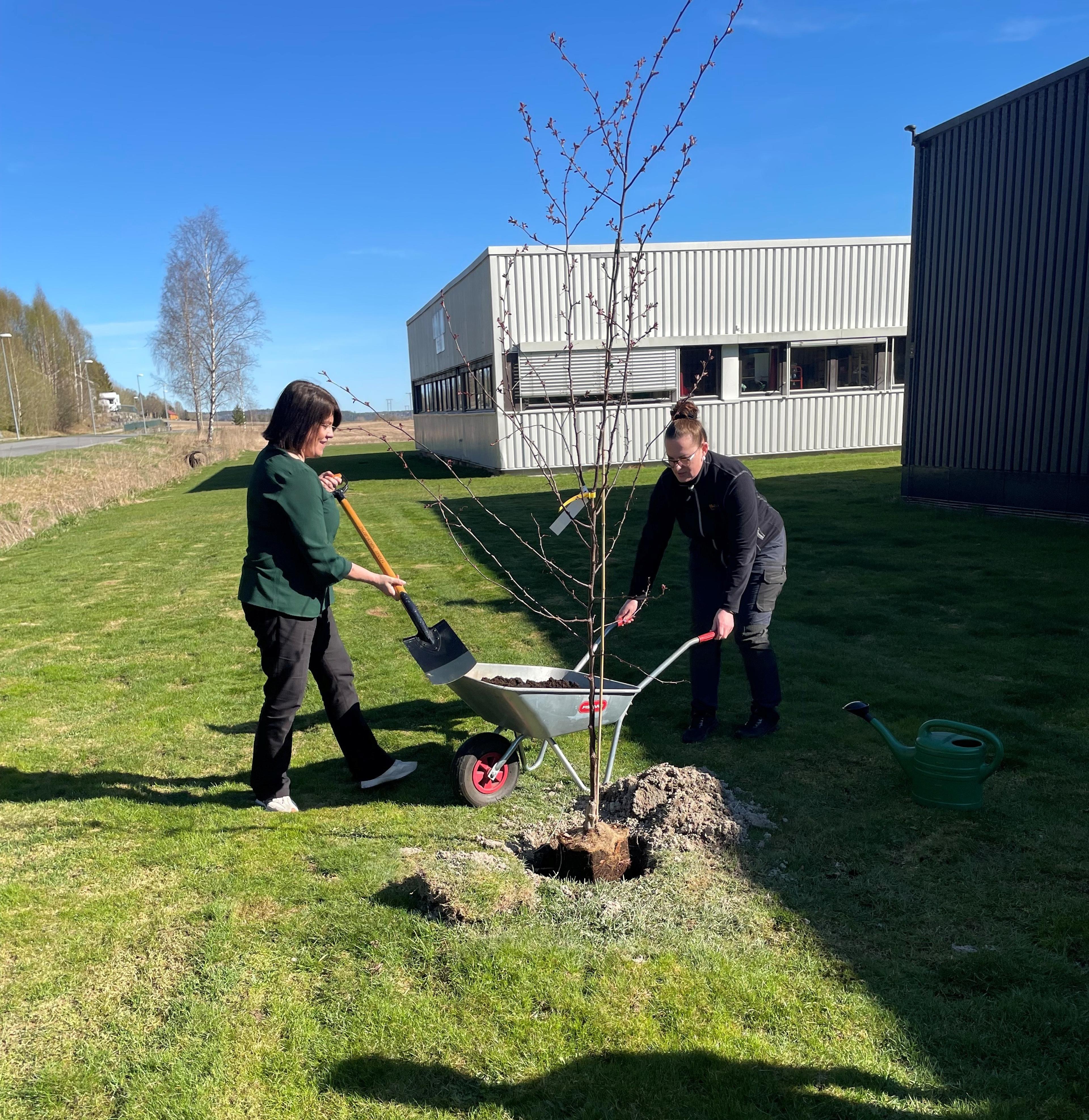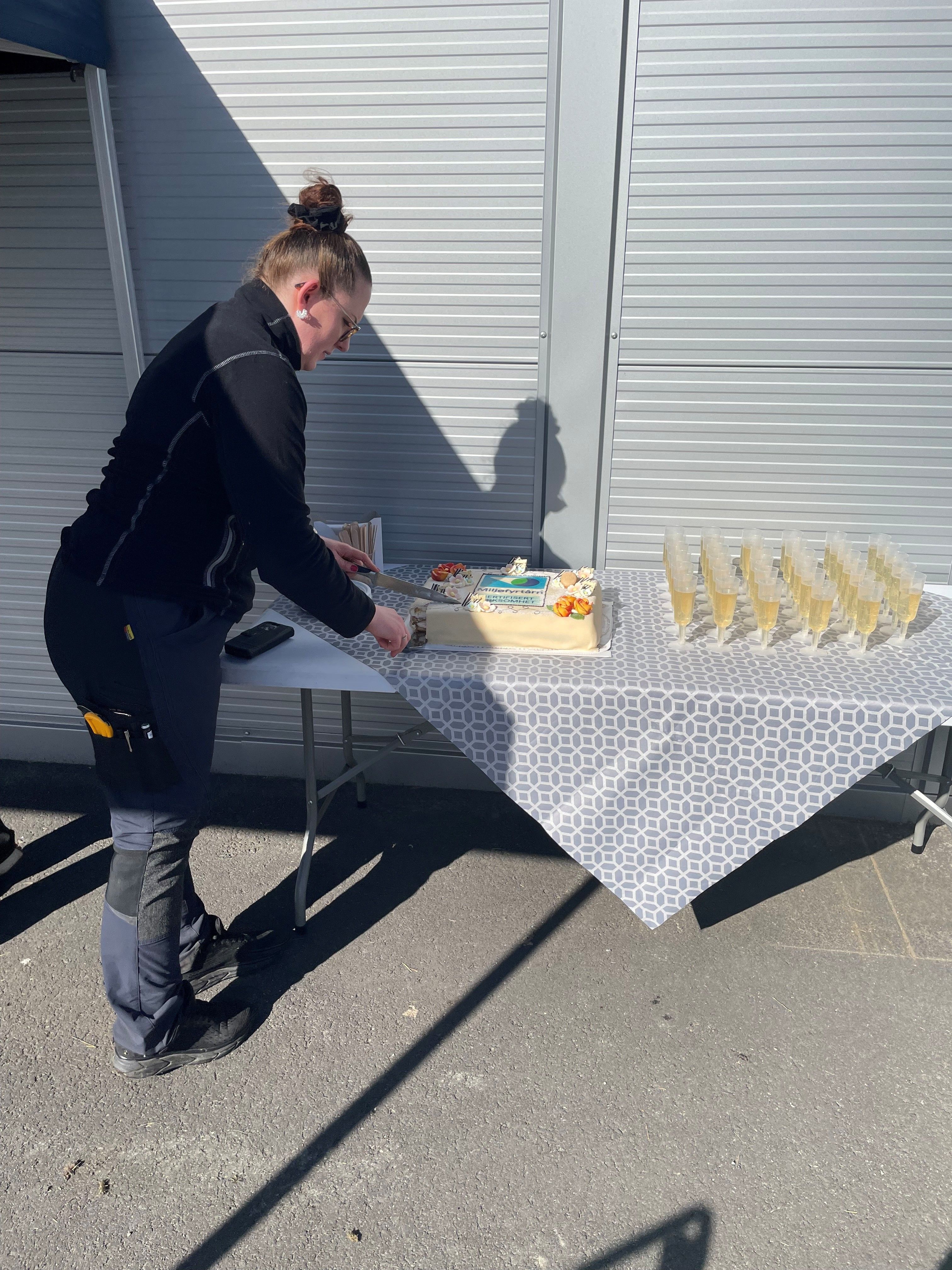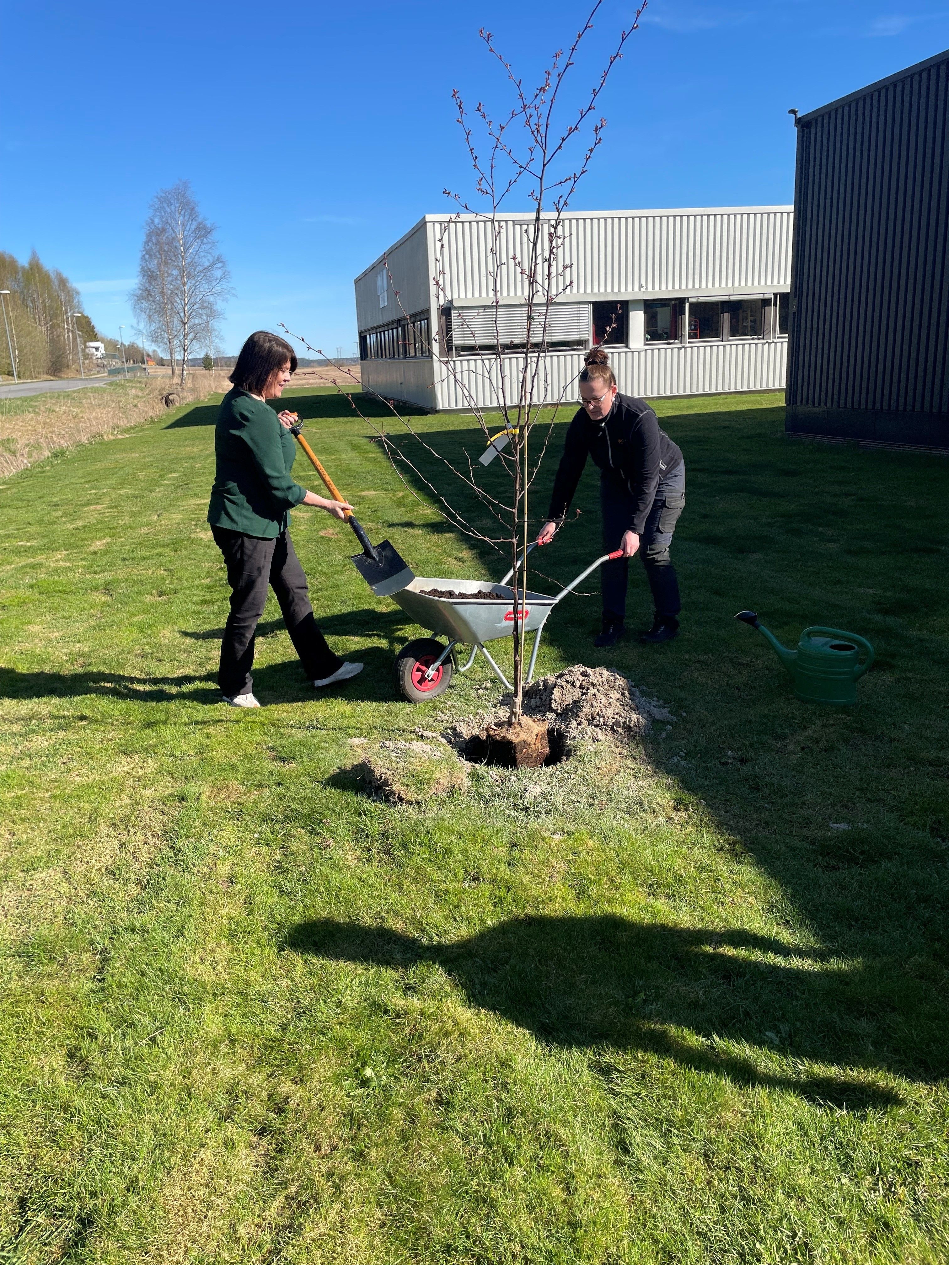 Ute på plenen lå alt til rette for en hyggelig markering. Med sol i ansiktet, nydelig kake på fatet og spader klare til dyst, var det duket for både seremoni og symbolikk. Flere hadde tatt turen, og blant dem var varaordfører Kathrine Hestø Hansen og næringssjef Terje Myrseth, som sto for den offisielle overrekkelsen av plaketten. Kathrine tok også grep – bokstavelig talt – og plantet et vakkert prydepletre bak bygget. Et ganske fint bilde på det hele, egentlig.